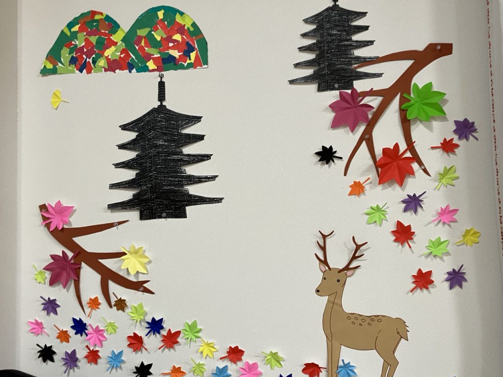 清水寺のような紅葉の風景に🍁動物たちが賑わいを添え、素敵な作品が完成しました🖌️🖼️