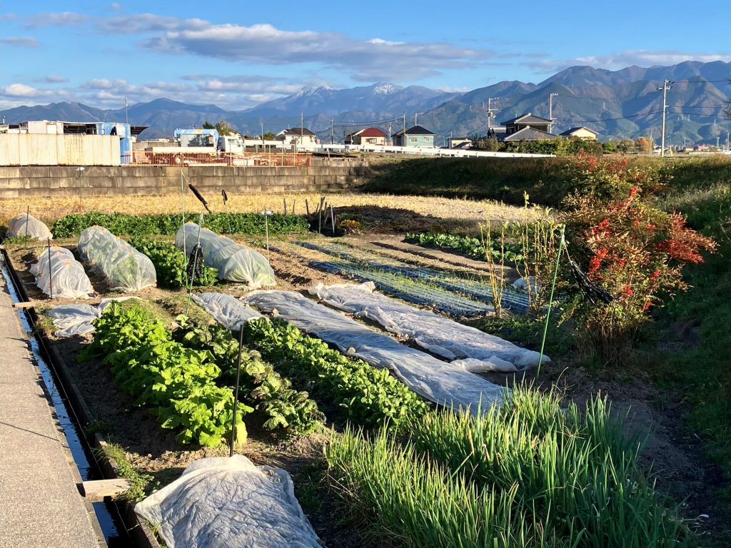 12月5日(金)の「かとれあ畑」の様子 遠く見える石鎚山は冠雪しています。この時点で霜対策すべきでした。