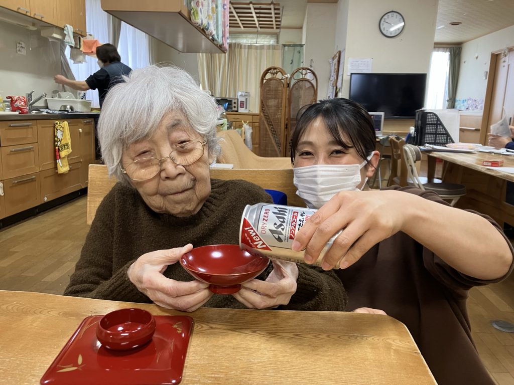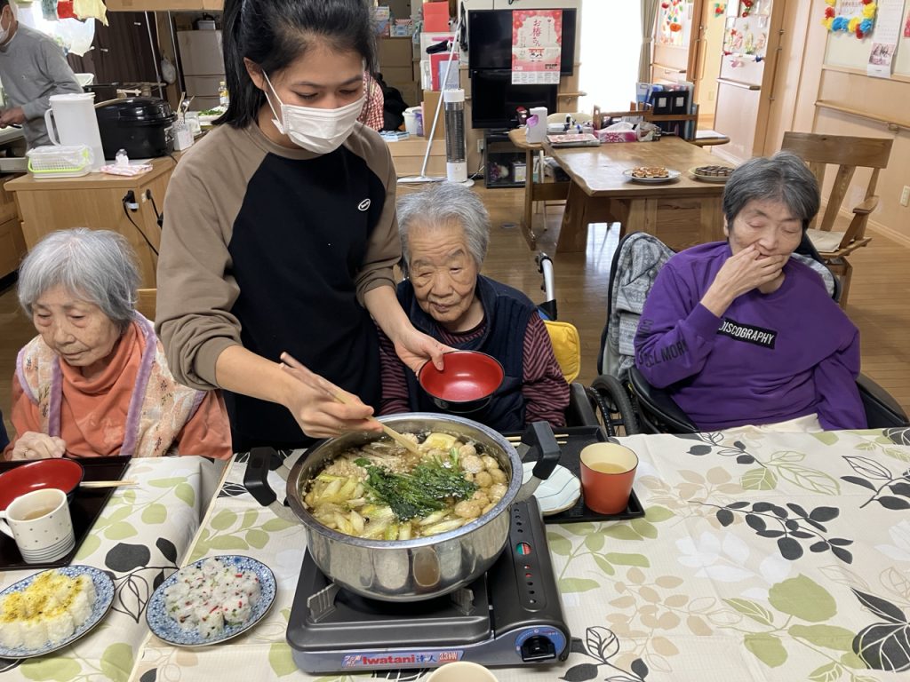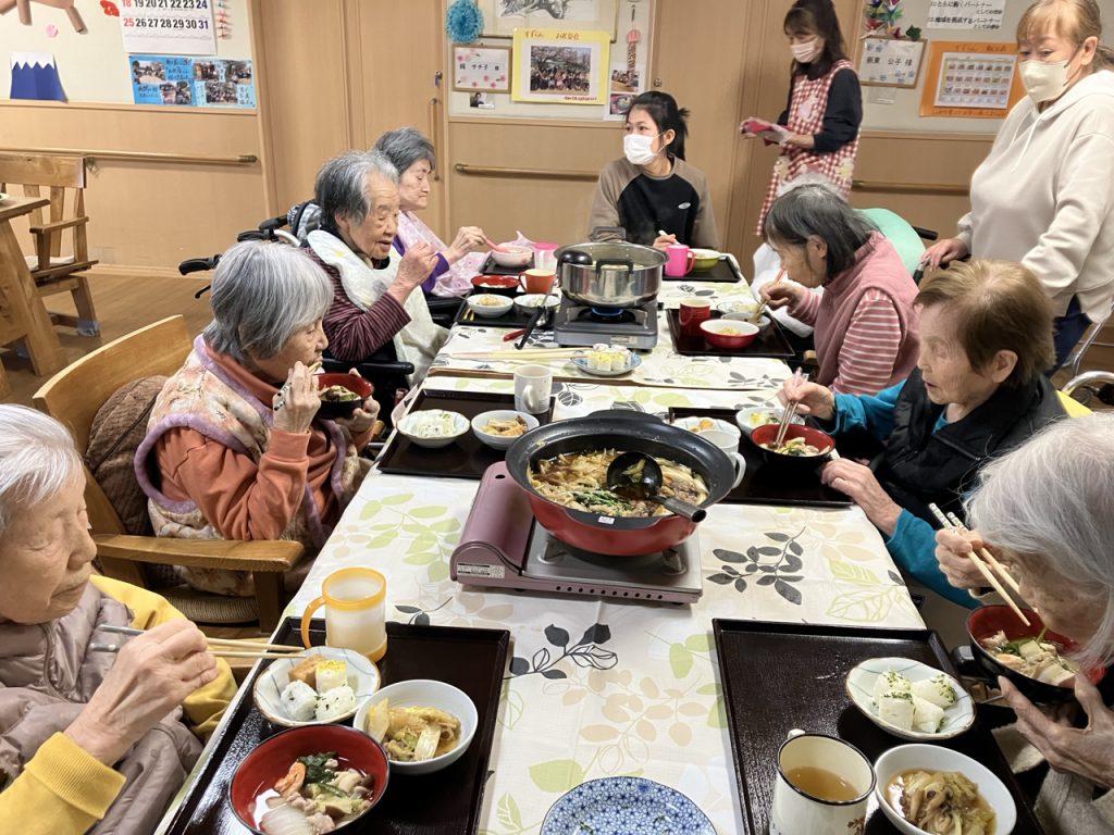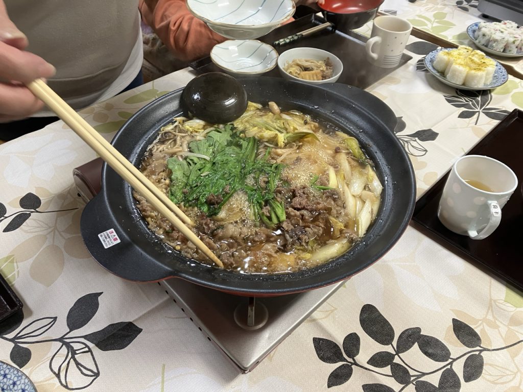 続いての「ミニ新年会」では、特別メニューの「寄せ鍋」や「すき焼き」に加え🎶