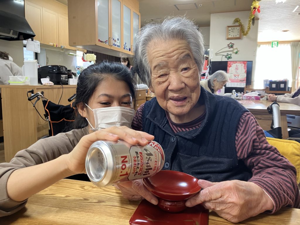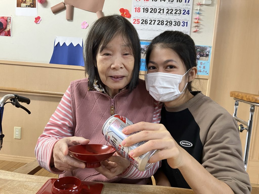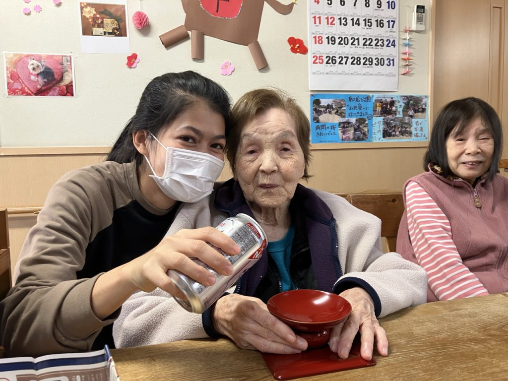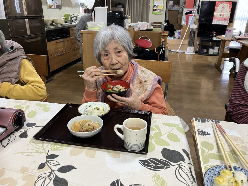 続いての「ミニ新年会」では、特別メニューの「寄せ鍋」や「すき焼き」に加え🎶